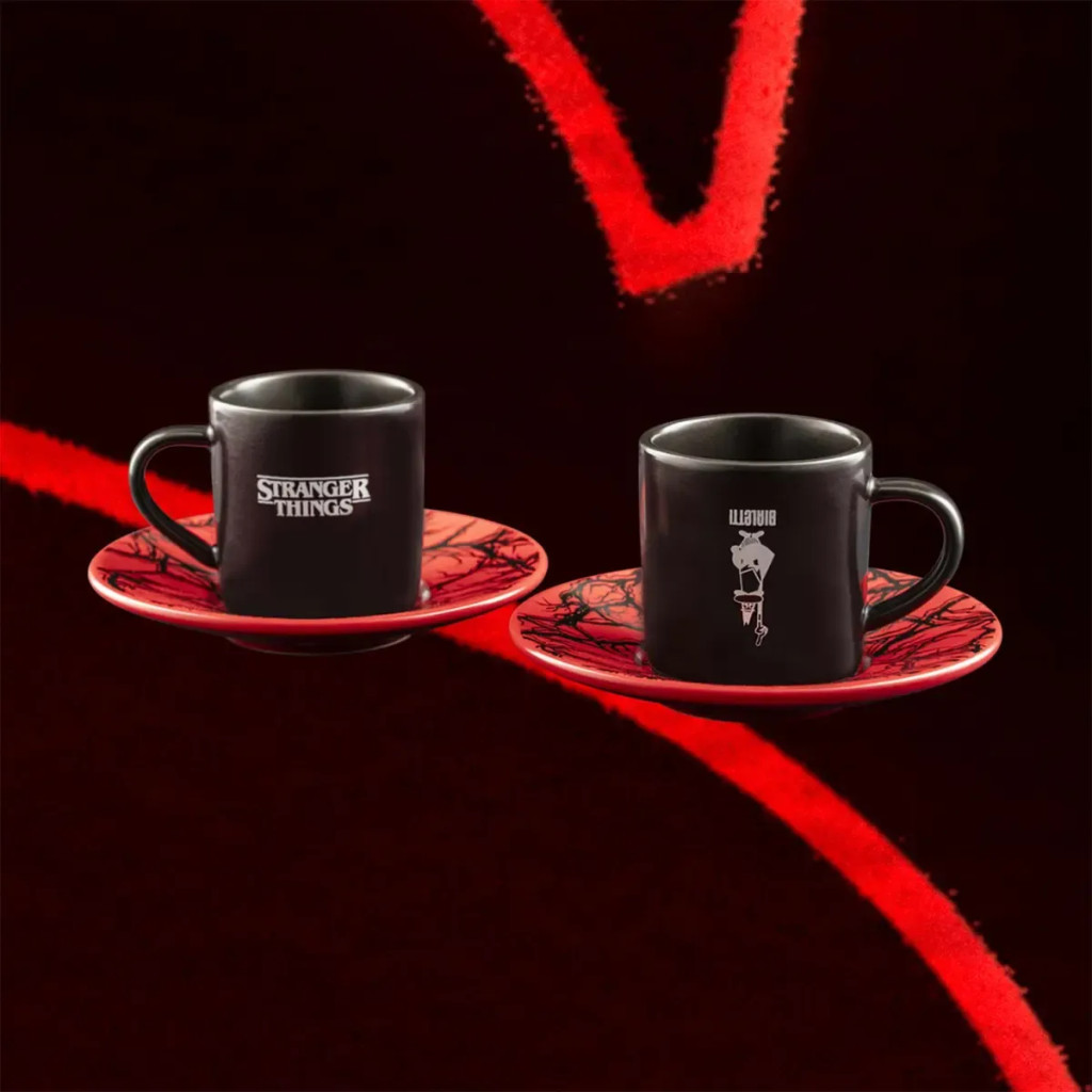 Az új Bialetti x Stranger Things kapszulakollekció szenzációs, új, praktikus, innovatív és hőre reagáló kerámiatermékeket tartalmaz. A hőérzékeny hatás rendkívüli. A kerámia hővel érintkezve megváltozik, feltárva az Upside Down ihlette részleteket. A két Stranger Things ihlette eszpresszócsésze csészealjakkal minden rajongó számára kötelező darab. Hideg állapotban a csésze feketének tűnik, amelyeket hátborzongató alakok jelölnek, amelyek az Upside Downból bukkannak elő. A kávé kitöltésekor a csésze pirosra vált, és fenyegető mintákat tár fel. Az Upside Down még soha nem volt ilyen közel. Egy olyan hatás, amely még különlegesebbé teszi a kávészünetet.