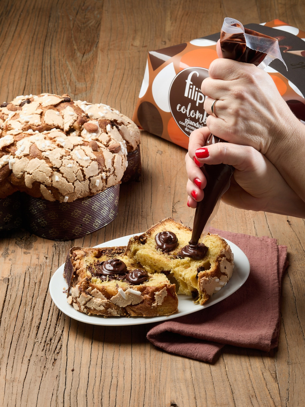 TÉSZTA 86%: búzaliszt, kandírozott narancs 13% (narancshéj, glükóz szirup, cukor), vaj, szabadtartású friss tojássárgája, tejcsokoládé cseppek gianduiával 10% (pörkölt piemonti mogyoró 20,9%, cukor, kakaóvaj, tejpor, kakaómassza, emulgeálószer: szójalecitin, természetes aroma: vanília, kakaó min. 36%) víz, nádcukor, természetes kovász (búzaliszt, víz), méz, só, természetes aroma: vanília