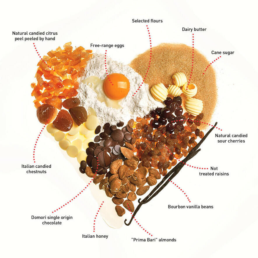 TÉSZTA (86%): búzaliszt, vaj, szabadtartású friss tojássárgája, kandírozott citrom (citromhéj 10%, glükóz szirup, cukor), csokoládé cseppek pisztáciával 10%, (pörkölt pisztácia 15%, cukor, kakaóvaj, tejpor, emulgeálószer: szójalecitin, természetes aroma: vanília), nádcukor, víz, természetes kovász (búzaliszt, víz), kandírozott narancs (narancshéj, glükóz szirup, cukor), méz, só, természetes aroma: vanília